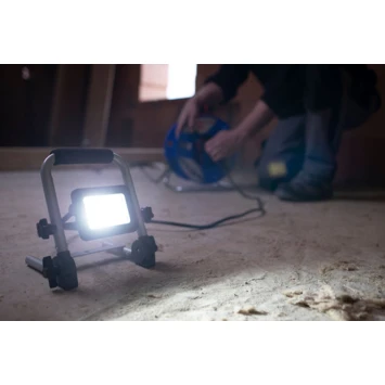 Mobiele LED- werklampEL 750 M, 9,9W, 900lm, IP65, 1,5m H07RN-F3G1,0 Voor gebruik binnen- en buitenshuis, IP 65. Solide, moderne aluminium behuizing. Ruimtebesparend door opvouwbaar frame. Stevig stalen buizenframe met kunststof beschermhoeken en ergonomisch gevormde schuimrubberen draaggreep. Spotlight traploos draaibaar en vergrendelbaar.
